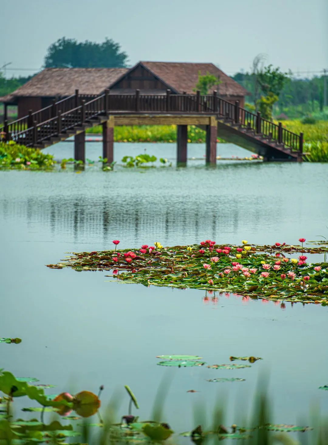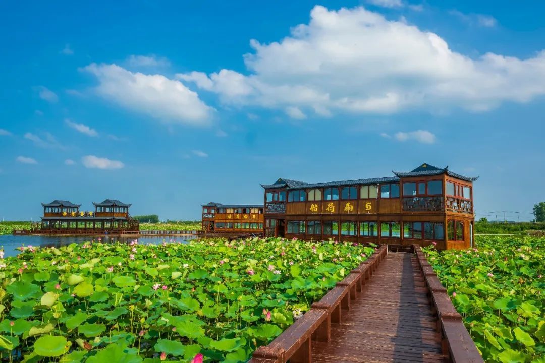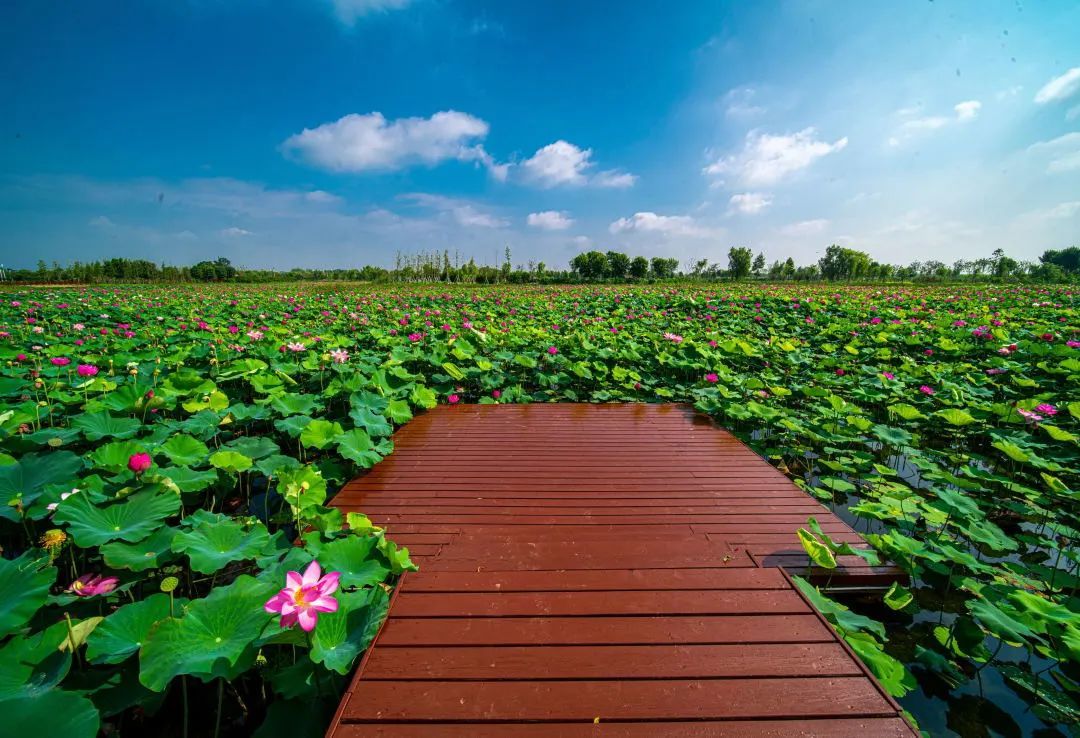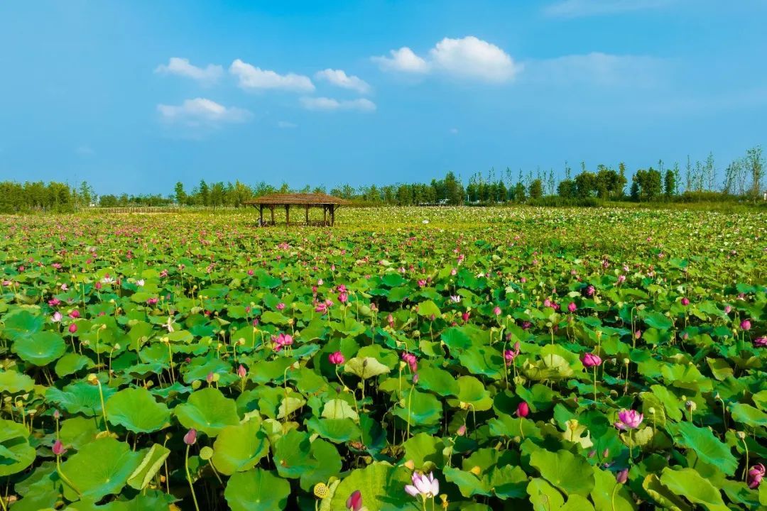 江苏省盐城市建湖县九龙口国家湿地公园“渔樵耕读”景区里,共有“太空红旗”、大足红莲等近400种水生花卉。从每年5月开始,基地各色水生花卉竞相开放,一直持续到10月份。