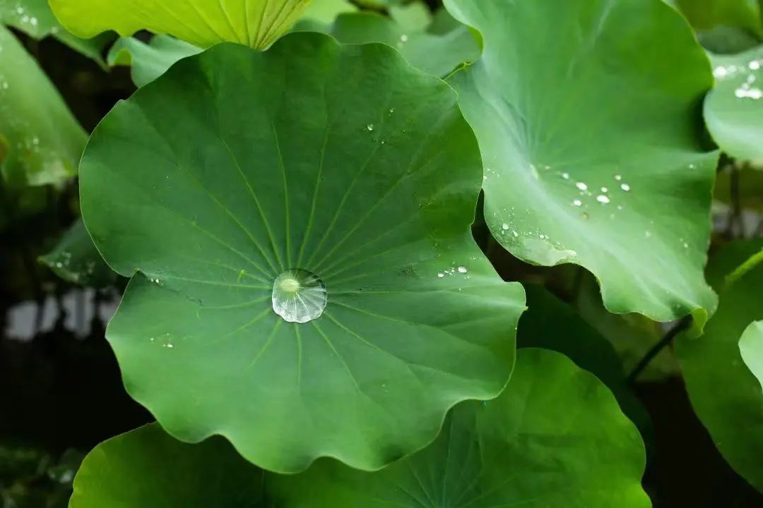 雨后的荷塘在亭台轩榭间散发着铅华洗净的宁静,水珠滚进荷叶里总是分外可爱,像从山坡上打了个滚,就留在荷叶的“山谷”里藏着,晶莹剔透。