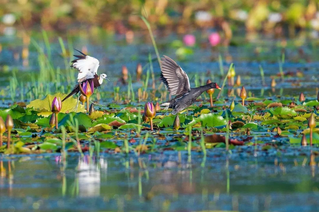 在水盈盈、娇滴滴的荷花间,鸟儿嬉戏、鸳鸯戏水,灵动、惬意、美好!