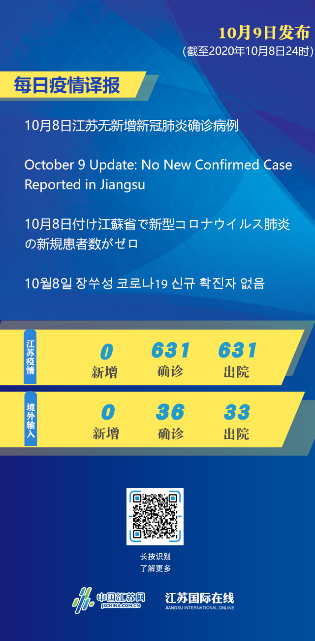 Between 00:00 and 24:00, October 8, no new confirmed COVID-19 case was reported in Jiangsu.As of 24:00, October 8, 667confirmed cases (including 36imported ones) have been reported in Jiangsu cumulatively, and all have been discharged from hospital except threeimported cases which werestill receiving isolated treatment atdesignated hospitals.