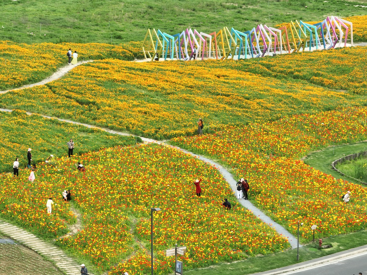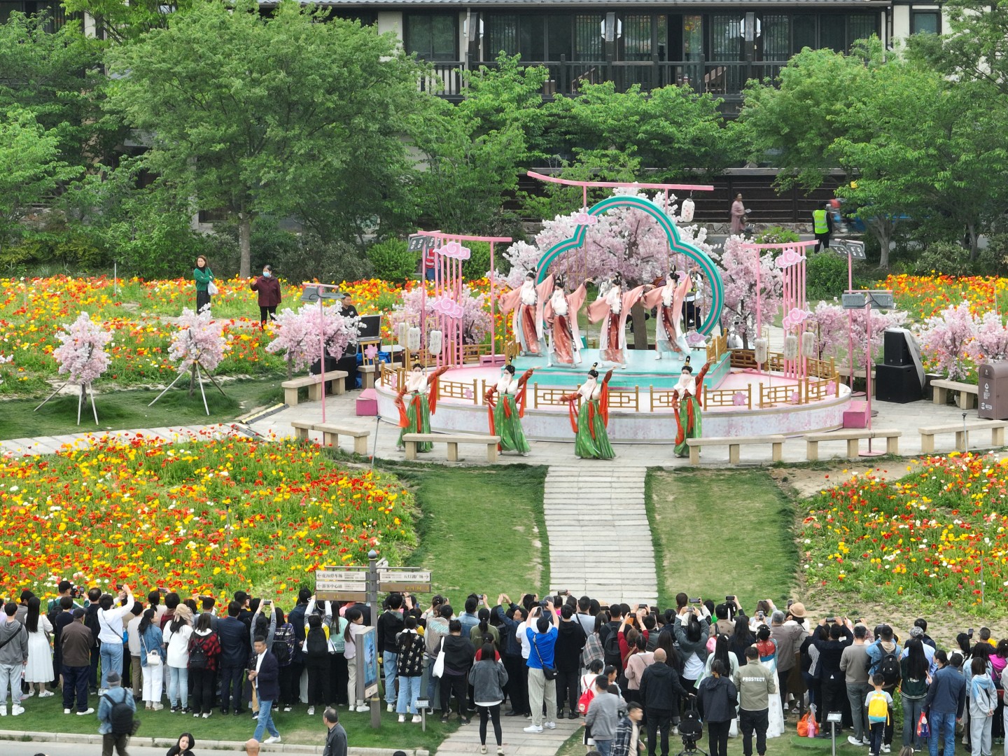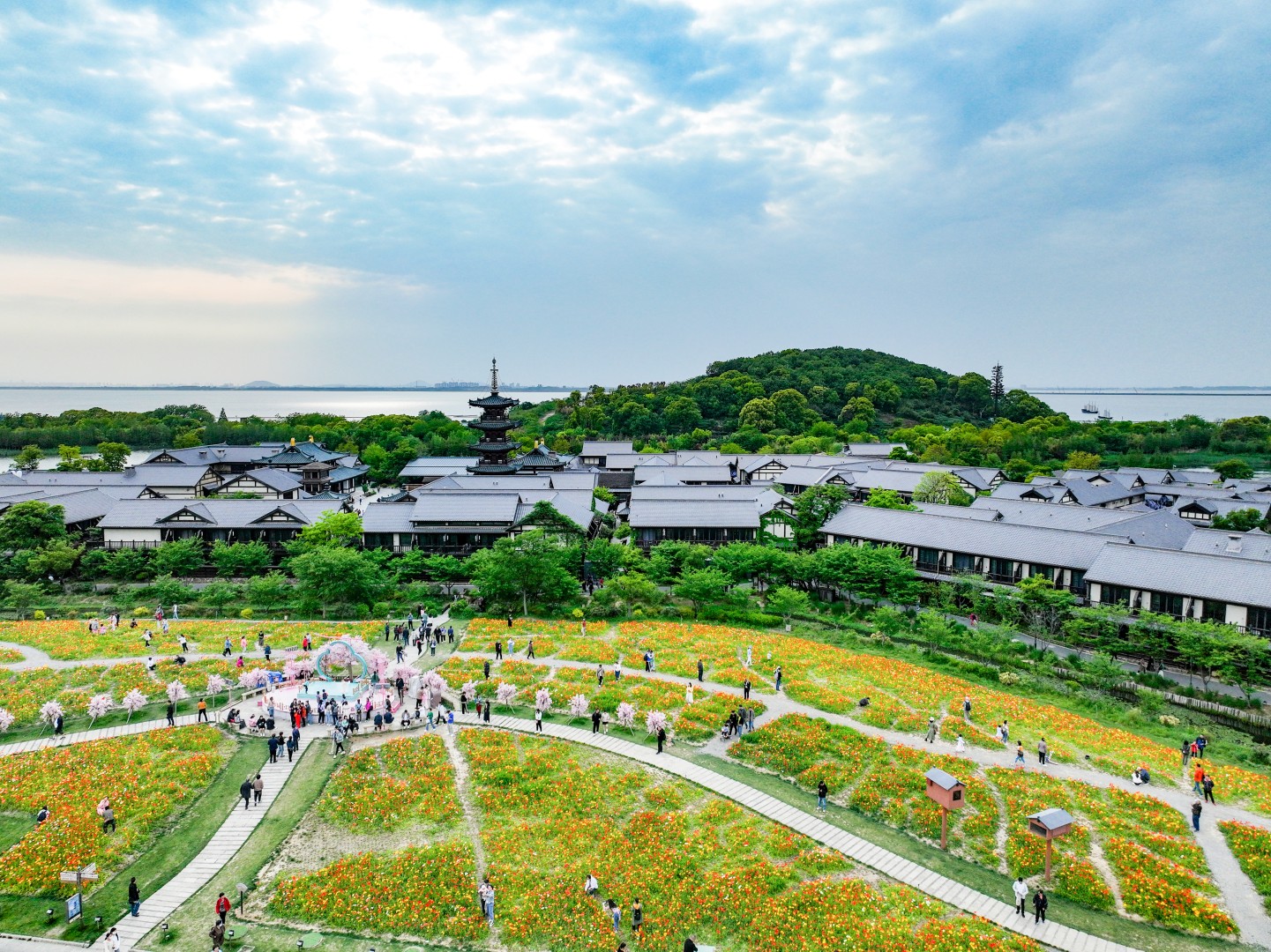 2023年4月22日,无锡拈花湾景区内百亩花海竞相绽放,繁花似锦,美不胜收,吸引众多游客前来赏花。为了避免“走马观花”,营造精细化、多层次的旅游体验,景区还新增了十多处大型花景艺术打卡点,打造持续半年的“为你花开满城”主题品牌,开启精致赏花模式。(邵丹 摄)