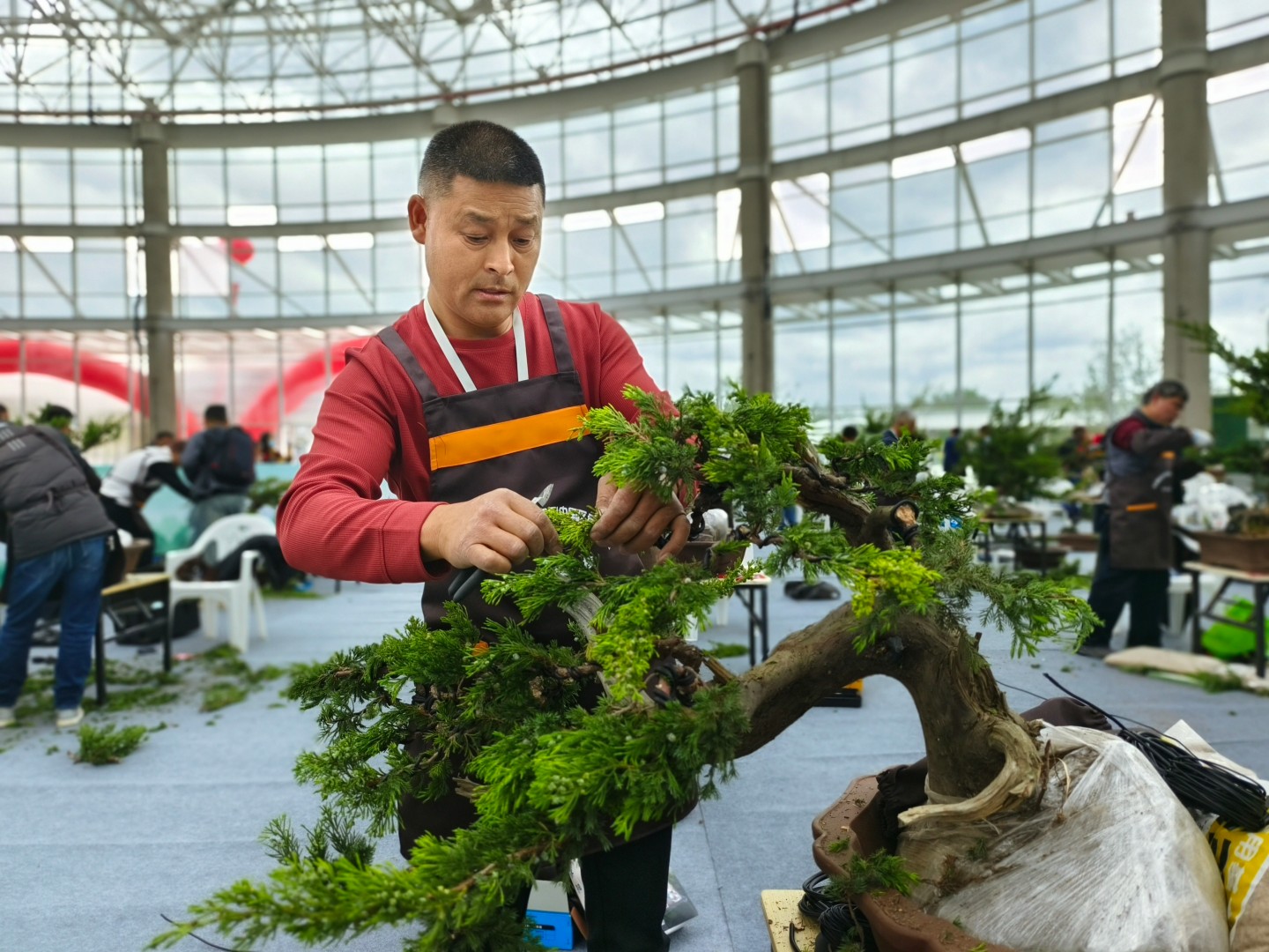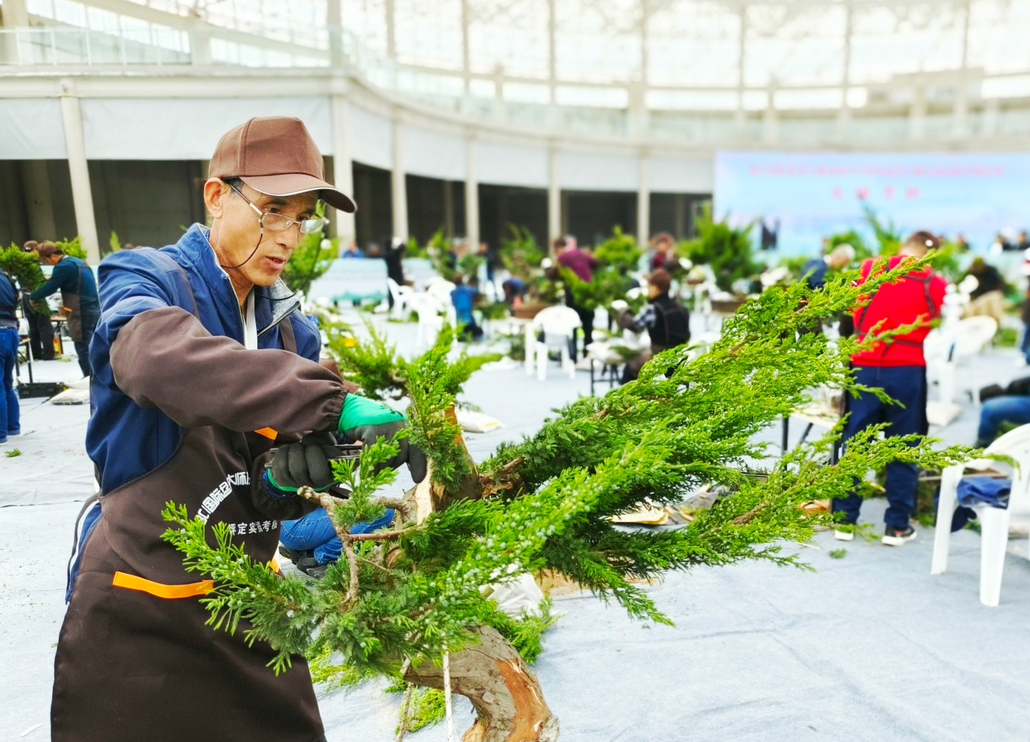 2023年4月24日,来自全国各地的80名盆景艺术家齐聚沭阳,参加在沭阳华东花木大世界举办的BCI国际盆景大师及 BCI中国区盆景大师评选实操考核。据了解,活动由沭阳县人民政府和BCI中国区委员会等单位主办,通过现场盆景制作实操考核,评选出20名BCI国际盆景大师、20名BCI中国区盆景大师。(丁华明 摄)