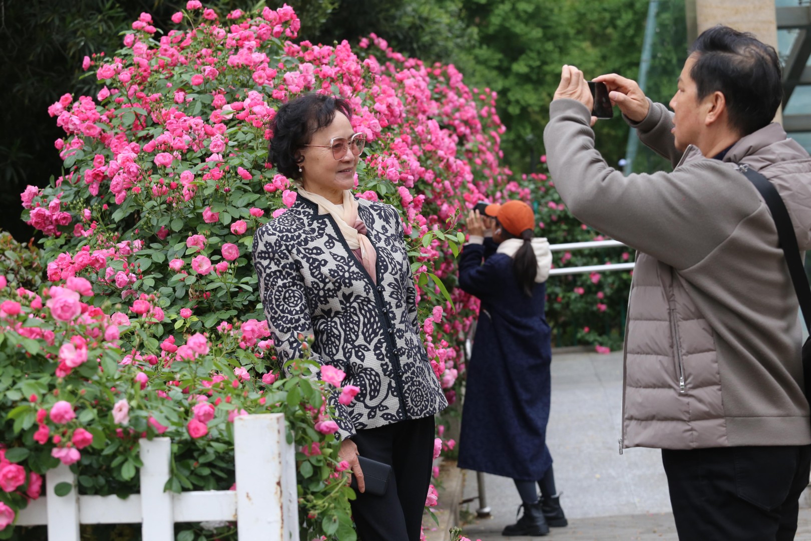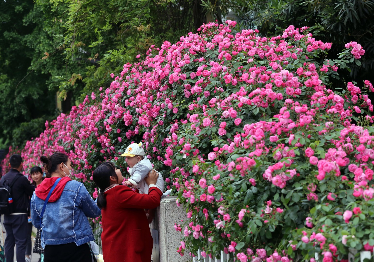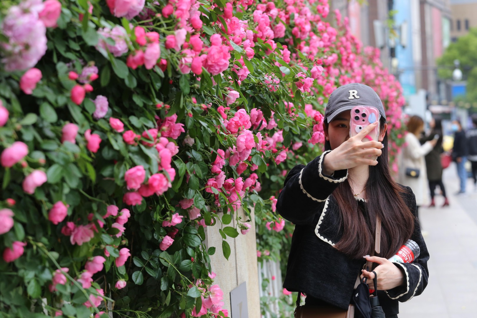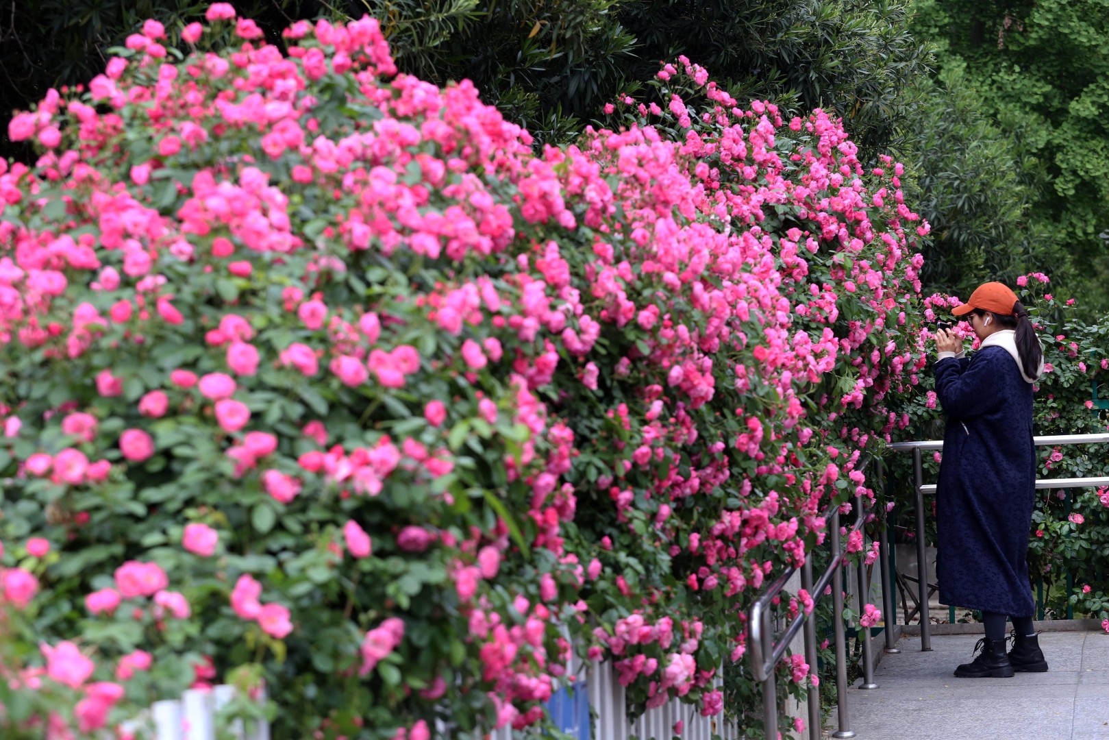 2023年4月25日,南京图书馆西侧长达百米的围墙上开满了蔷薇花,“蔷薇花墙”美丽上线,吸引市民前来赏花拍摄。(记者 宋宁 摄