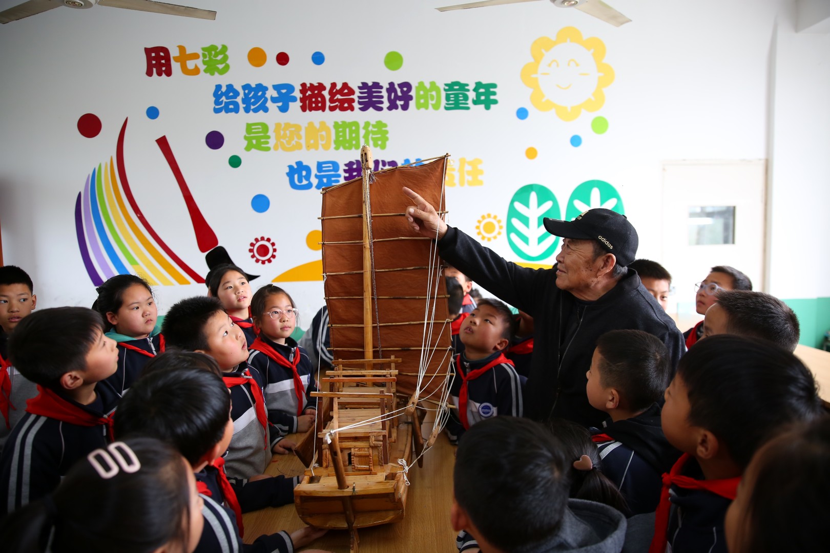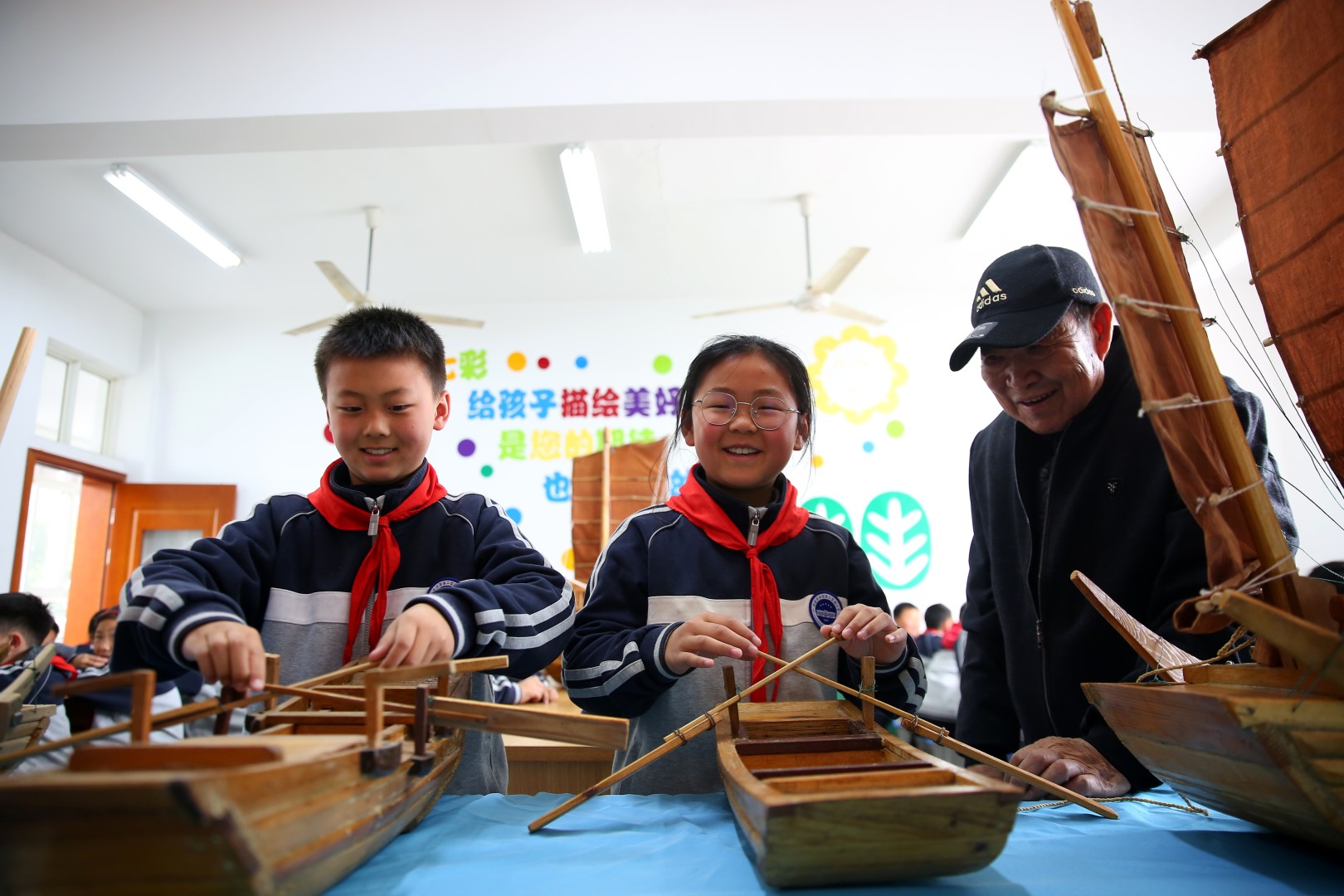 2023年4月25日,淮安市洪泽第二实验小学邀请“洪泽湖木船制造技艺”传承人走进课堂,为该校学生讲述洪泽湖木船的历史文化、传承渊源、制造技艺等知识,活动现场同学们和老师一起组装各类船舶模型。学生们专注听讲、认真练习,对非遗文化表现出了浓厚的兴趣。(陈凯 摄)