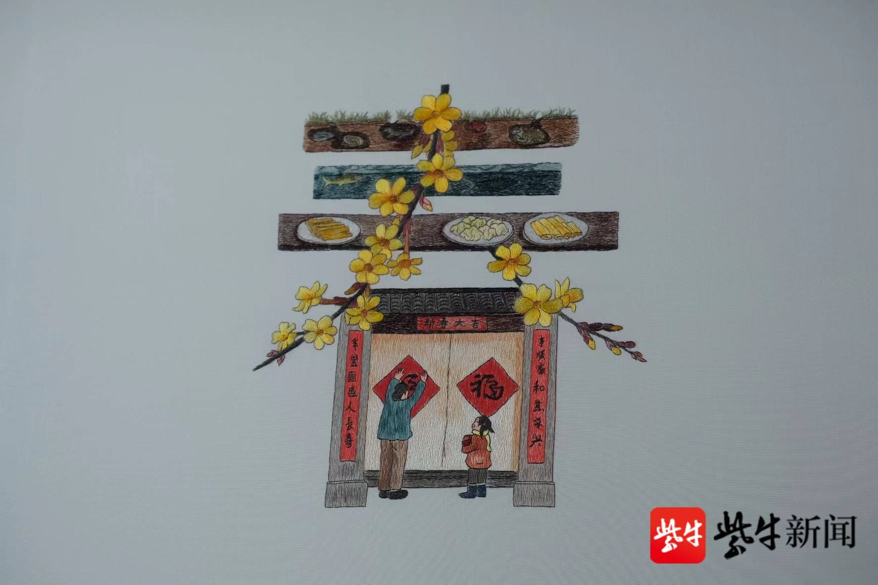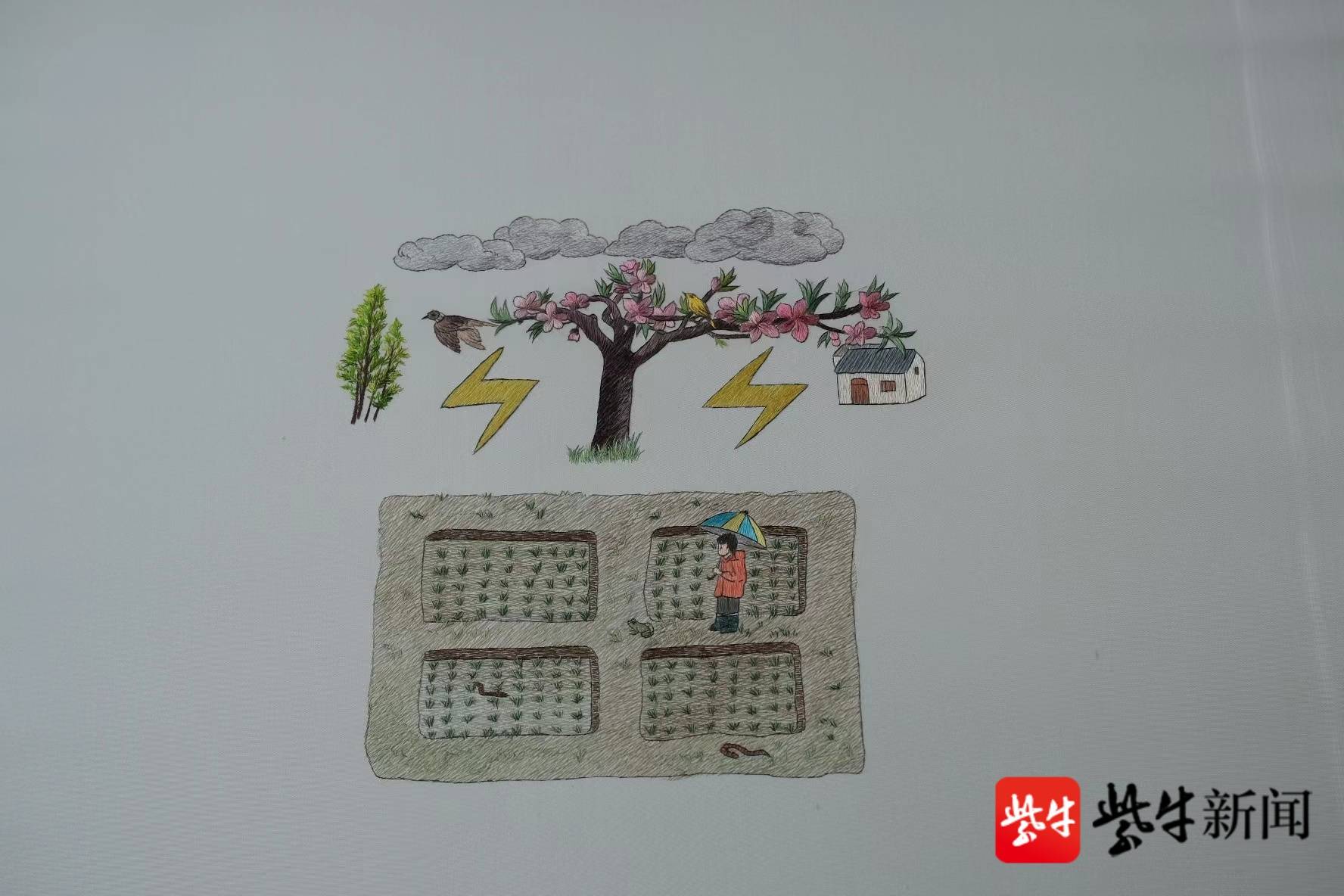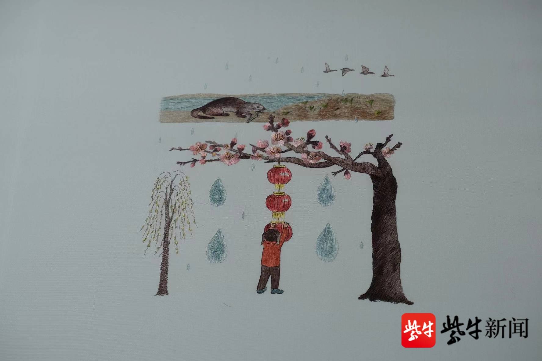 记者在陈红英刺绣艺术馆看到,苏绣艺术家陈红英正坐在绷架前绣制着“二十四节气”中的“雨”字——上面一横里藏着好多雨水节气的物候信息:如獭祭鱼、候雁北和草木萌动,左边是一棵随风摇曳、吐着嫩芽的柳树,右边是一株开花的杏树,中间一竖则表现了人们正在挂灯笼欢度元宵佳节的民俗场景(每年的元宵节往往在雨水节气前后),四点雨滴表达了春季降雨开始,雨量渐增。陈红英告诉记者,整个画面是以雨水滋润大地为主体,体现了春天万物复苏的场景。每个字上的元素非常丰富,需要去深入了解“二十四节气”,观察每一个细节。