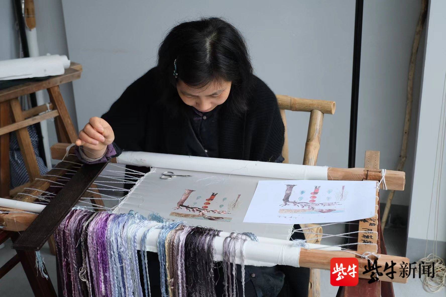 陈红英说:“整个画面颜色非常丰富,光‘春’字这个作品就用到了三十多套颜色,一套颜色有十几种。”记者看到,作品中的迎春花看起来非常灵动,花以金黄色和橘红色为主,树枝上带点青绿色和紫红色,仅仅这里就用到了五套颜色。陈红英认为,苏绣看起来特别美丽,最主要的是靠色彩,作品第一眼看到的就是色彩的搭配,近看工艺的精致,最后再看整体画面的协调。