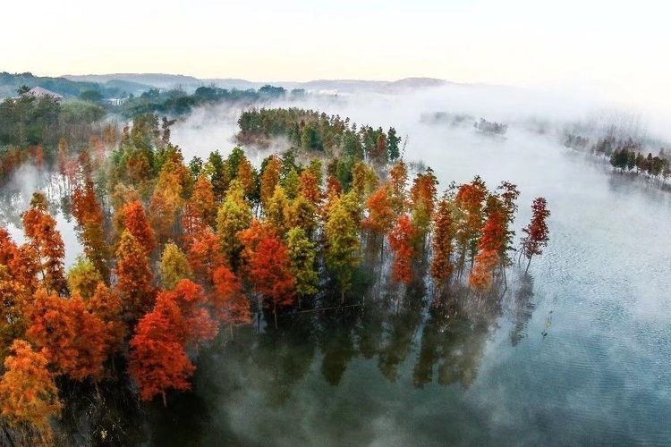 湖水、红杉、晨雾……逆光中,随手一拍,就是一幅画。