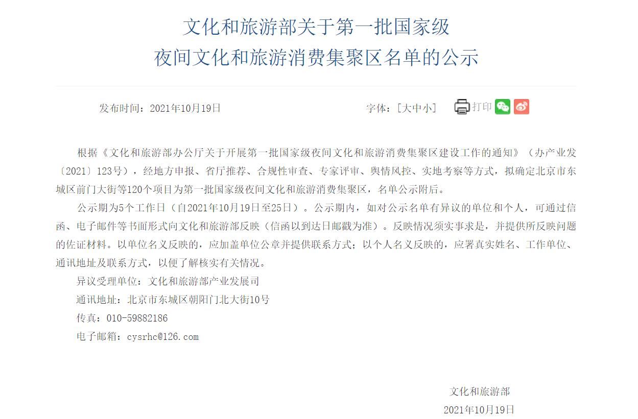 我苏网讯10月19日,文化和旅游部发布《关于第一批国家级 夜间文化和旅游消费集聚区名单的公示》,根据《文化和旅游部办公厅关于开展第一批国家级夜间文化和旅游消费集聚区建设工作的通知》(办产业发〔2021〕123号),经地方申报、省厅推荐、合规性审查、专家评审、舆情风控、实地考察等方式,拟确定北京市东城区前门大街等120个项目为第一批国家级夜间文化和旅游消费集聚区,名单公示附后。