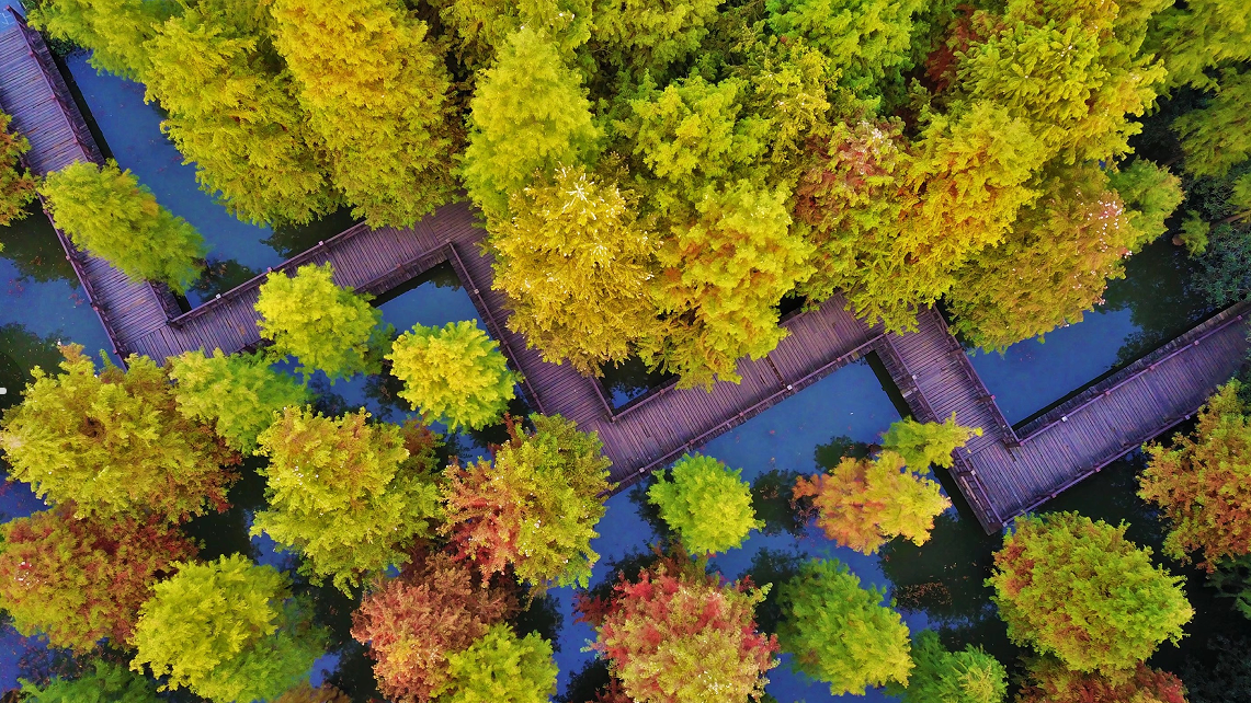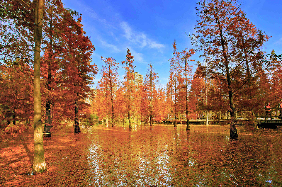 疏影瘦秋水,层杉染嫣红。翠竹公园占地十多亩的墨西哥落羽杉,每年到11月中旬,杉树叶就会被秋风染得或黄、或红,从空中俯瞰,如同一幅缤纷绚烂的油画,总能吸引不少游客前来打卡。