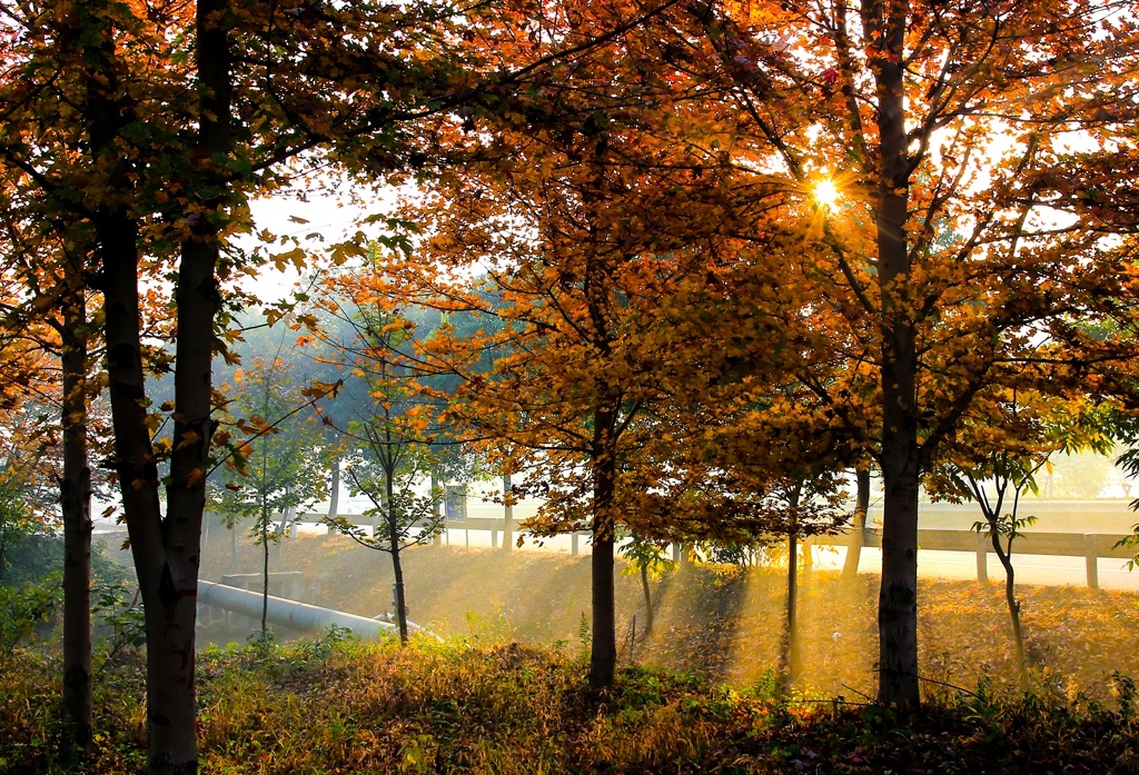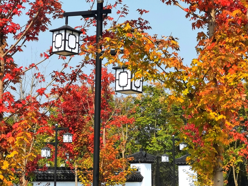 微风轻轻拽着落叶,在半空中打着旋儿,阳光透过树梢倾泻,留下一片五彩斑斓,煞是好看。无论是眼下那片片的红枫、潺潺的碧水,还是远处的袅袅炊烟……任意一隅都是一幅美丽而绚烂的画卷。