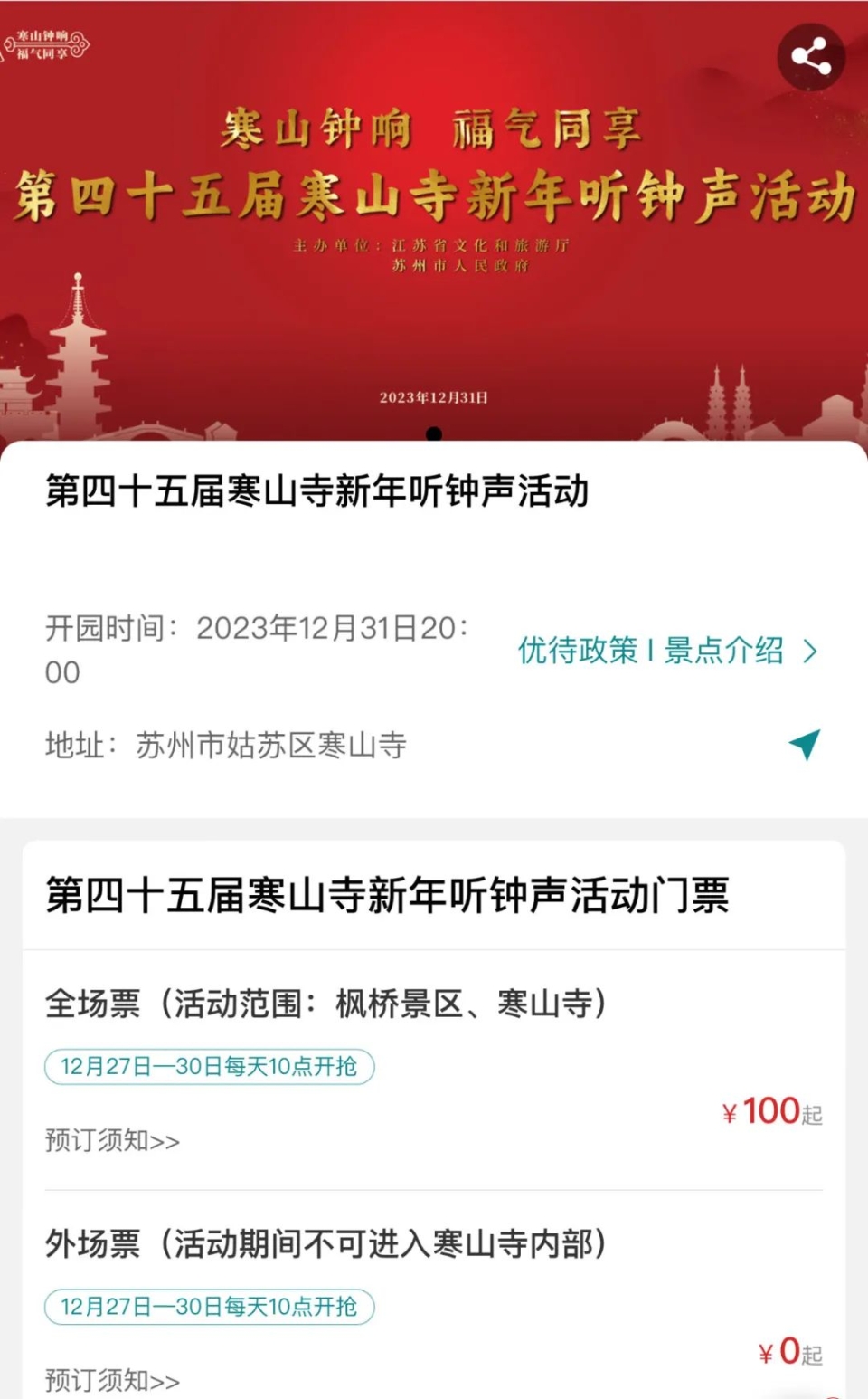 活动以“寒山钟响 福气同享”为主题,现场将有主题灯组、情景演出、普明塔秀、聆听钟声等十项重点活动,市民可以在科技与国潮、古风与现代的碰撞中,度过热闹祥和的跨年之夜。活动门票将于12月27日早上10点开始销售,截止到12月30号17点。