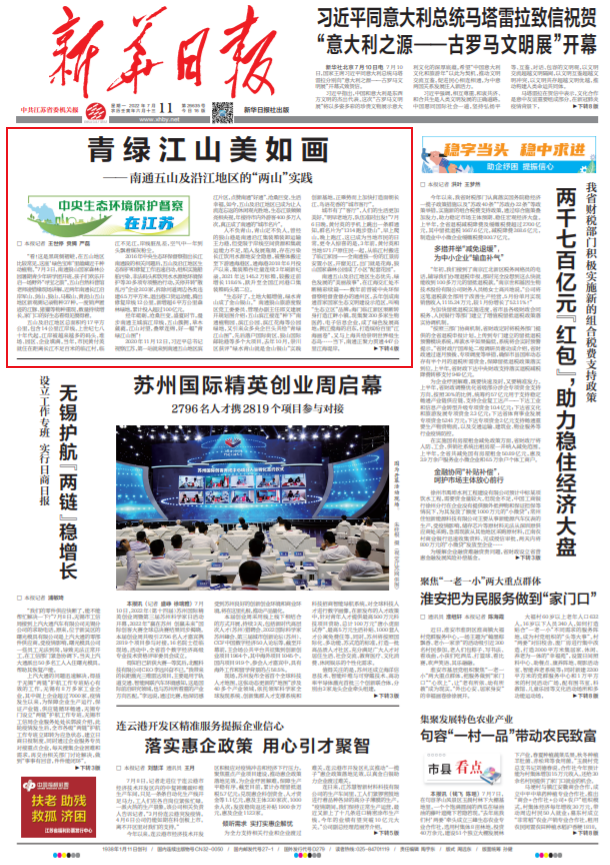 “环境空气质量连续四年保持全省最优,国考断面水质改善幅度全省第一。”南通市生态环境局局长程炜报出一组数字,“十三五”以来,全市生态环境质量持续改善,空气优良天数比率88.2%,PM_2.5浓度30微克/立方米、省内首批率先达到国家二级标准,集中式饮用水水源地水质达标率100%,省考以上断面水质优Ⅲ比例93.5%……去年,五山及沿江地区生态修复保护工程被评为全省首届“最美生态修复案例”,入选国家林草局首批典型案例。今年6月,南通生态文明建设相关工作先后获国务院、省政府督查激励。